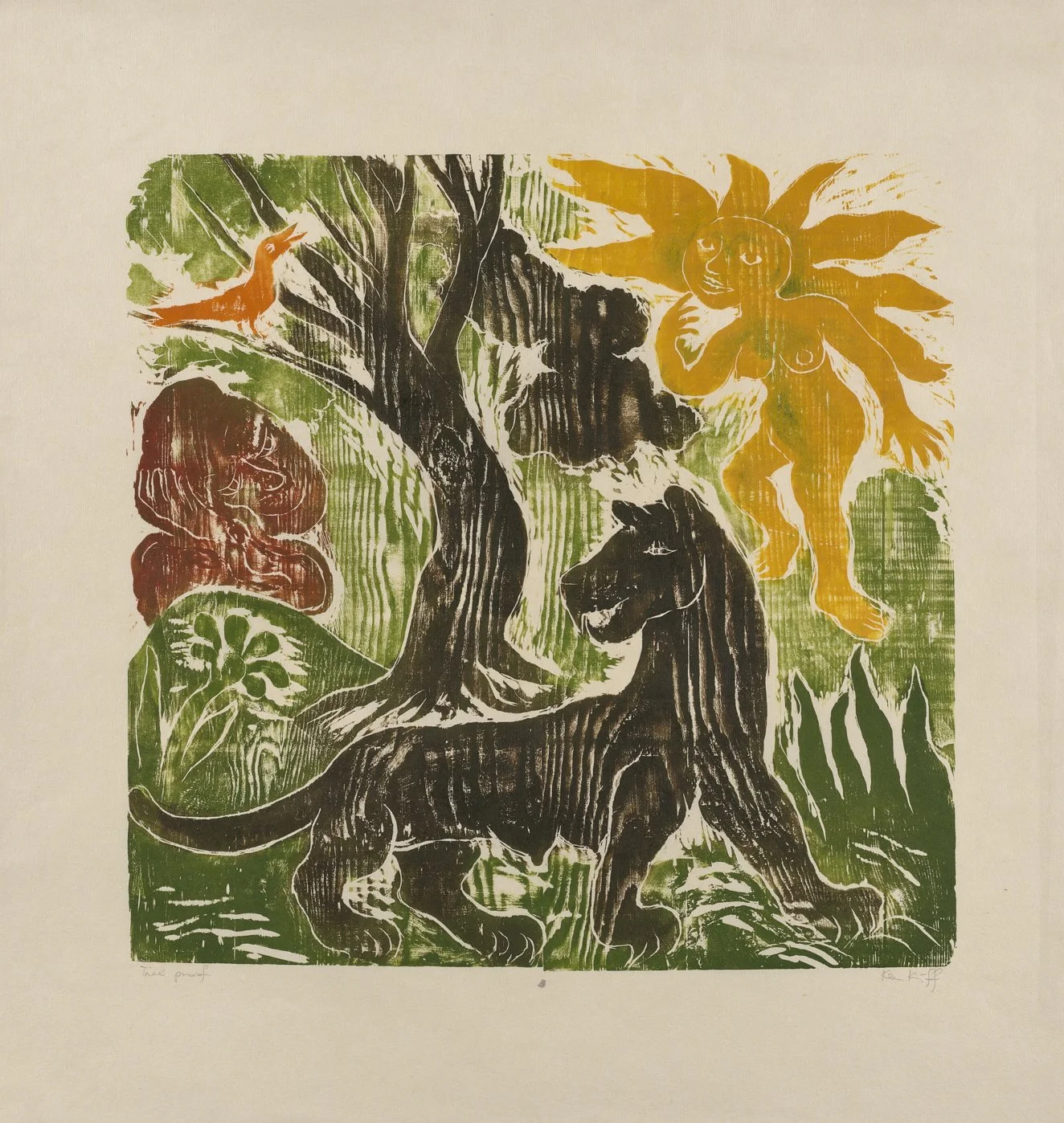 A solo exhibition of prints by Ken Kiff RA in the Belle Shenkman Room at the Keeper's House. The earliest print in this show is a woodcut made in his studio at home in 1981, while the later works include a complex drypoint from his National Gallery residency in 1993. His visual poetry interacts with the materiality of the medium to striking effect.